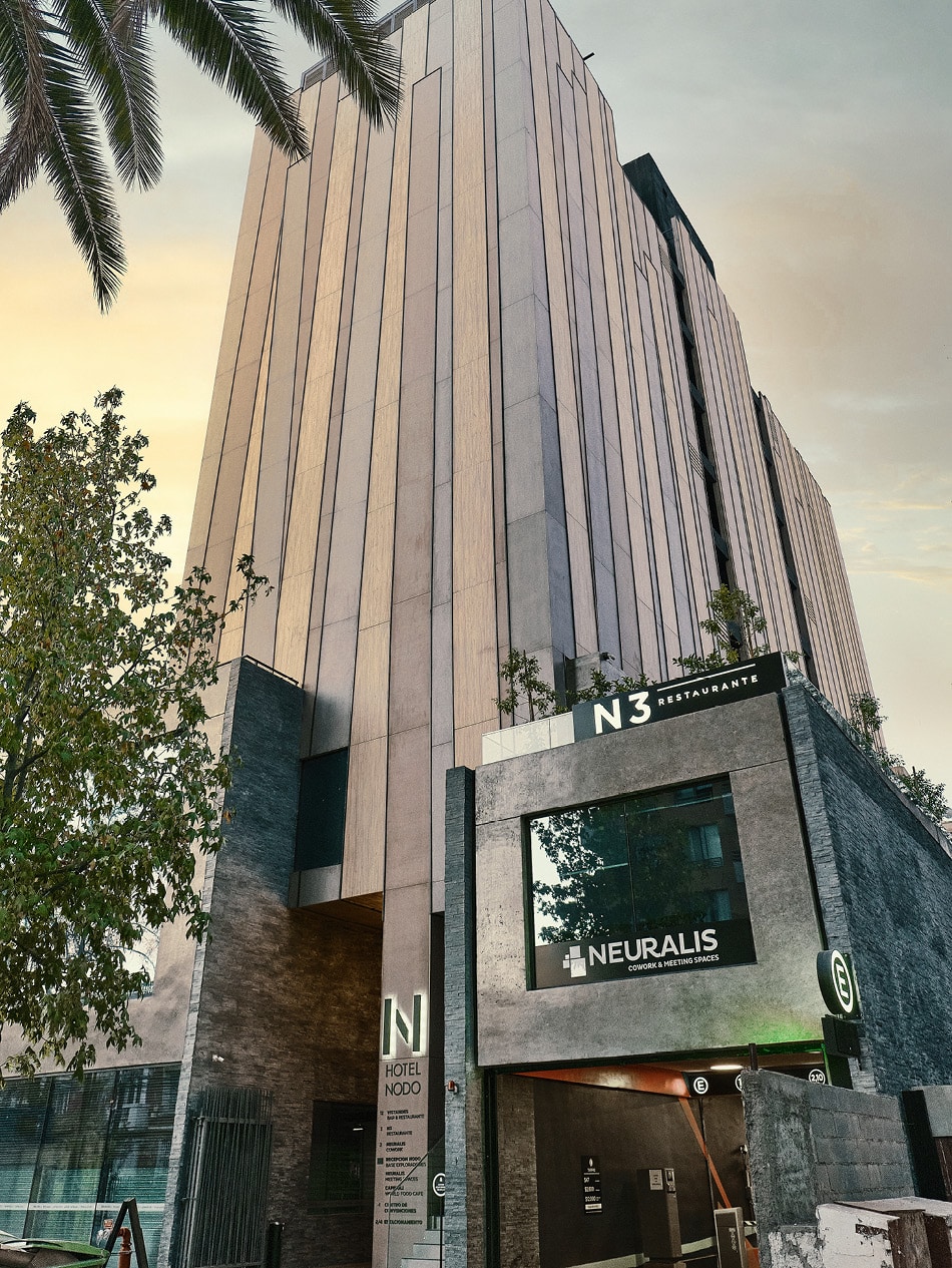Отель Nodo — это островок природы в городе. Отель, фасады которого облицованы прошедшими биоактивную обработку поверхностями Laminam, стал первым зданием, построенным в чилийской столице Сантьяго в рамках активной борьбы с загрязнением воздуха в Южной Америке. Архитектор Рикардо Стейн разработал проект, призванный не только воспроизводить красоту леса на улицах города (создавая своего рода природный ландшафт), но и выполнять те же функции, то есть очищать воздух — как рукотворный и при этом живой организм.