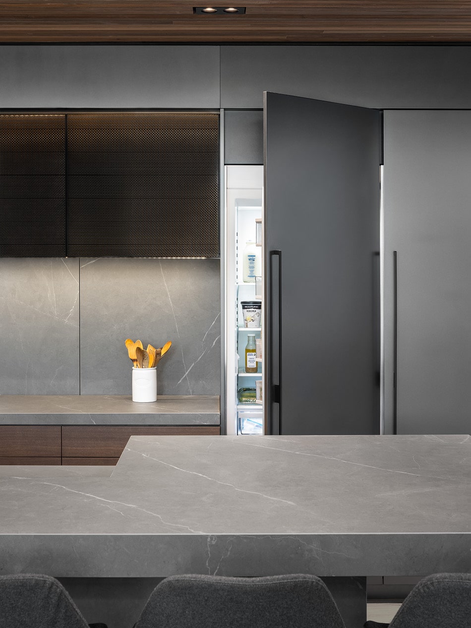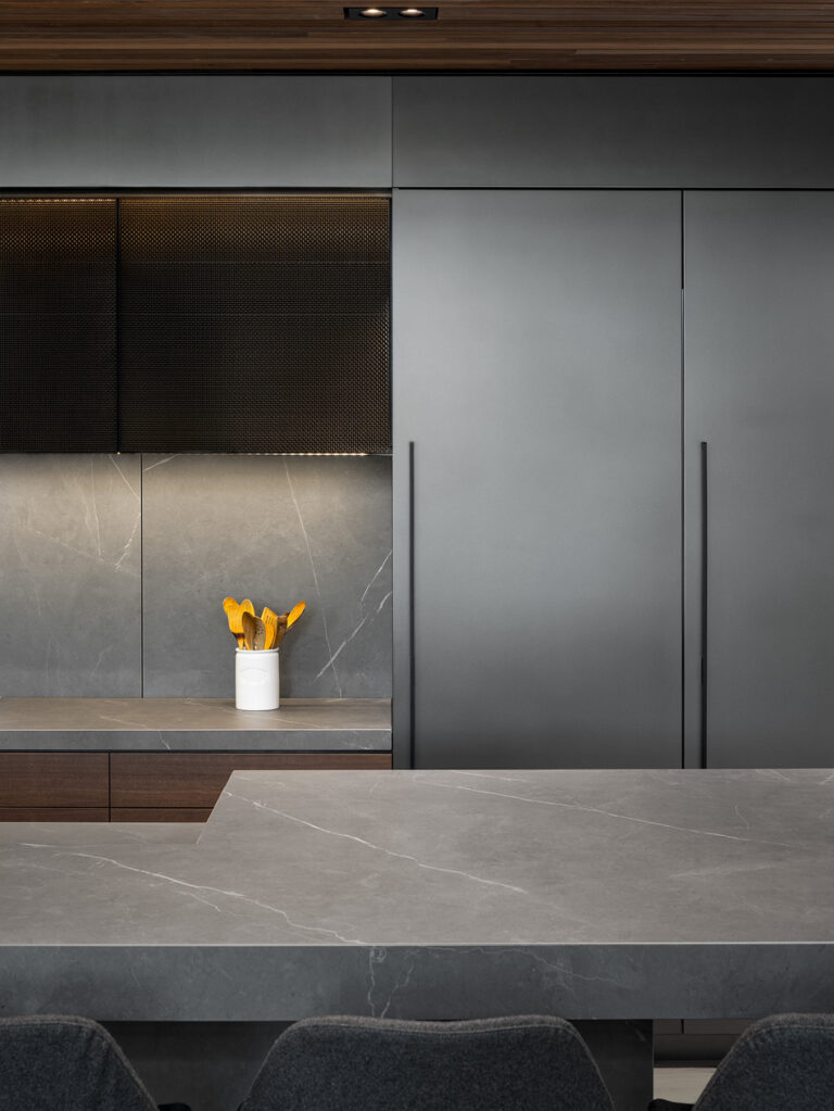 Для оформления кухни — столешницы, фартука, острова и полок буфета — были использованы поверхности Laminam Pietra Grey Naturale в размере 1620 x 3240 с толщиной Laminam 12. Эти поверхности из коллекции I Naturali, создатели которых вдохновлялись знаменитым мрамором, носящим то же название, обеспечивают единство концепции, а цветом напоминают уголь или графит. Тонкий рисунок прожилок на Pietra Grey придает этим поверхностям особую эстетику, а их универсальность позволяет создавать единый ансамбль в интерьере. Так, на кухне предусмотрена барная зона: все полки в специальной скрытой нише за ультрасовременными дверцами из алюминия сделаны из плит Laminam. Еще одним примером переосмысления пространства и индивидуального подхода к дизайну может служить практичный шкафчик для специй, который закрывается раздвижной дверцей, отделанной Laminam Pietra Grey. Та же поверхность была использована для изготовления столешницы и зоны приготовления пищи. Если в кухне, которая служит наглядным подтверждением того, насколько хорошо поверхности Laminam подходят для контакта с продуктами питания, преобладают линейность и практичный подход к планировке, то в гостиной царит атмосфера уюта и комфорта. Этому во многом способствует приглушенное освещение: густая листва деревьев за окном защищает обитателей от слишком яркого солнца.