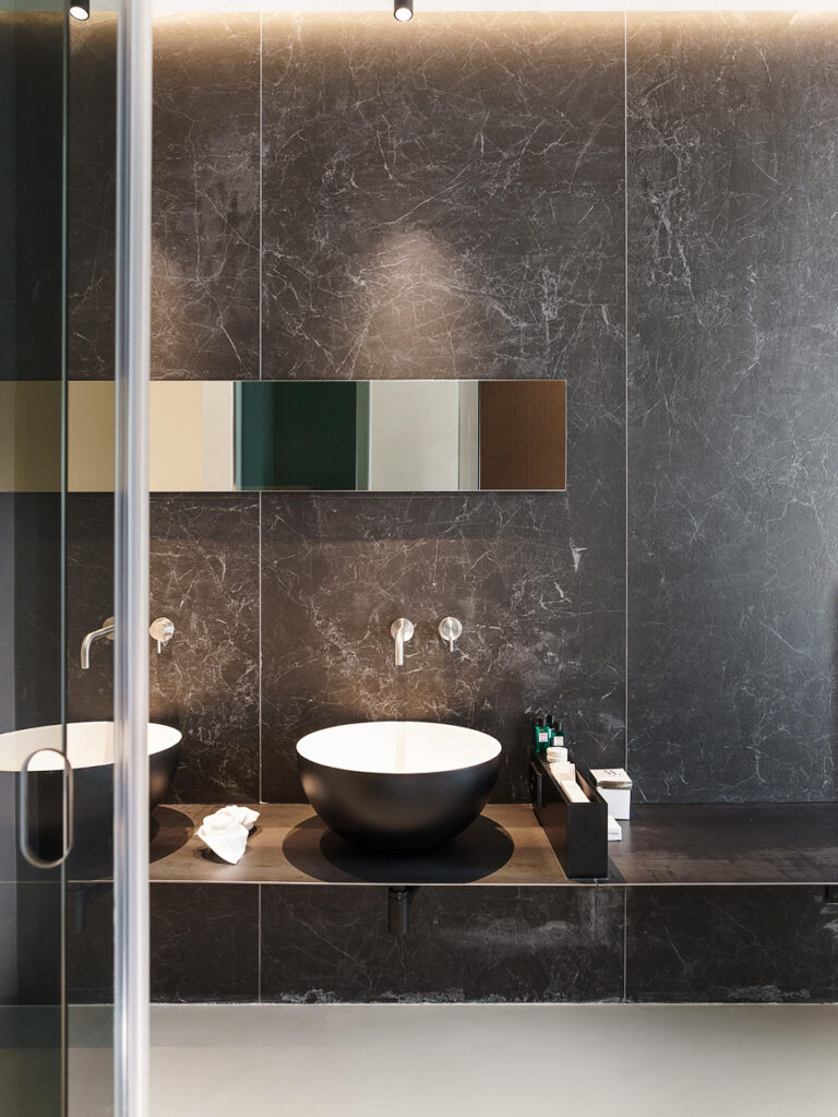 Этого эффекта удалось добиться за счет использования разных поверхностей Laminam, которые отличаются многообразием толщины, текстур, оттенков и размеров и позволяют обеспечить концептуальное единство в масштабах любого интерьера. Поверхности Laminam из коллекций I Naturali, Calce и Seta, выбранные для облицовки ванных комнат в номерах и в качестве изголовья кроватей, создают в рамках отеля целостное и изысканное пространство, воплощая всю суть эффекта Laminam.