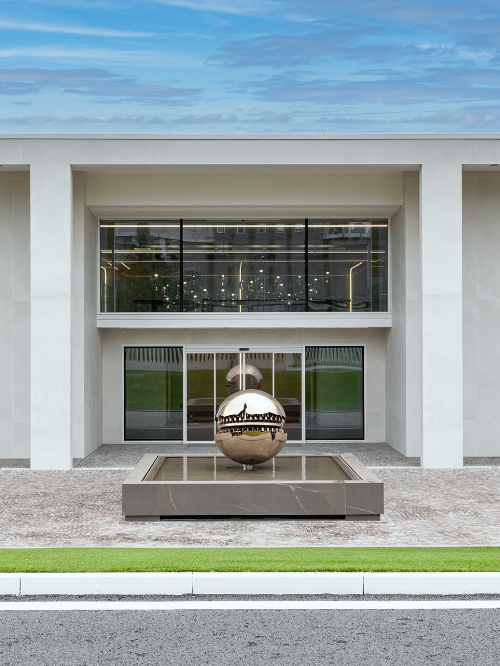 У входа в здание всех посетителей встречает знаменитая скульптура великого современного скульптора Арнальдо Помодоро, представляющая собой одну из его знаменитых бронзовых сфер — геометрическое совершенство, которое свойственно всем творениям мастера. Кажущаяся простота этой сферы обманчива: если приглядеться, то через трещины и разломы на ее гладкой поверхности становятся видны многочисленные сложные внутренние детали.