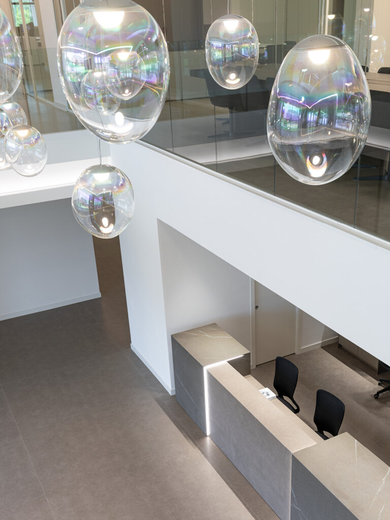 Поверхности из коллекции IN-SIDE также служат общим элементом, который концептуально объединяет наружную и внутреннюю части здания. Pietra Piasentina Grigio были использованы не только для облицовки резервуара, в котором установлена скульптура, но и для отделки величественной внутренней лестницы со светодиодной подсветкой на входе в здание. Этот стратегически и эстетически обоснованный выбор объясняется желанием придать помещению дополнительную легкость и подчеркнуть достоинства материала, который задействован в разных элементах интерьера. Пространства высотой в два этажа, где освещение обеспечивается за счет светодиодных трубок, напоминают творения американских минималистов: так, игра света, символов и прозрачных деталей придает дополнительную гармонию рабочему пространству.