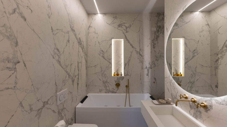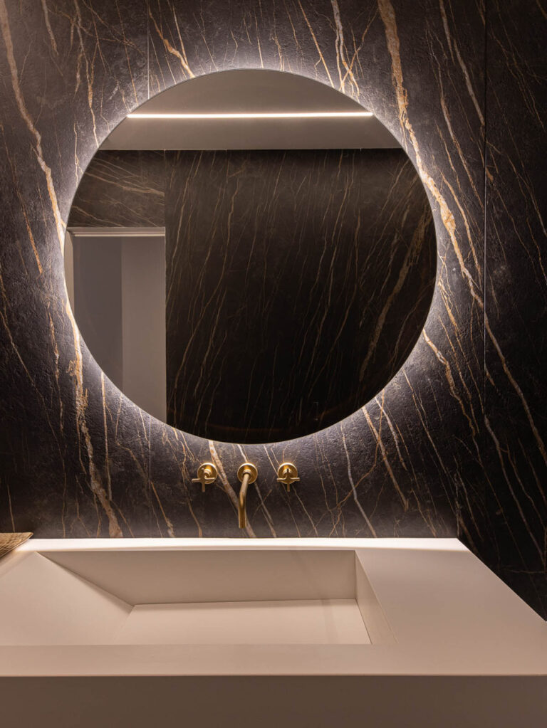 Palazzo BN — это идеальное сочетание нестандартного дизайна и тонкого вкуса. Для отделки барной стойки в ресторанном дворике был выбран оттенок Bruno из коллекции Ossido (большой размер 1620 × 3240 мм, толщина Laminam 5+), потому что этот материал представляет собой достоверную имитацию процесса окисления пластинок меди: переливающиеся оттенки металла словно запечатлевают стремительный бег времени.