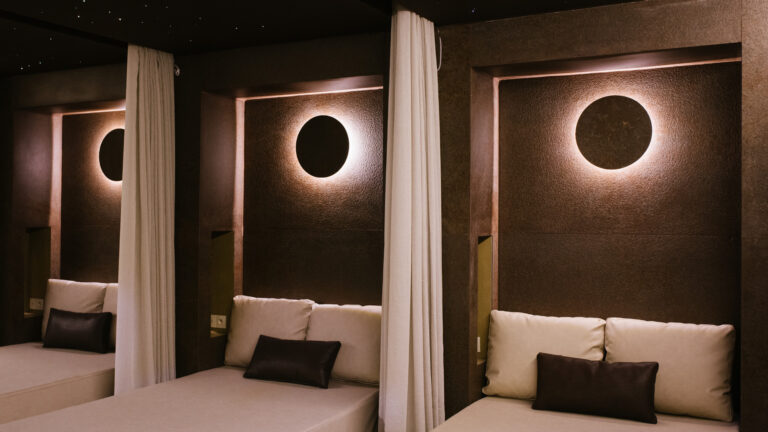 Широкоформатные керамические поверхности идеально подходят в качестве любых покрытий в номерах и местах общего пользования. В номере Ya Amar для отделки полов и стен были использованы большие плиты Calacatta Oro Venato Polished в размере 1000 × 3000 мм: на керамическом полотне цвета слоновой кости, которое покрывает не только пол, но стены номера, проступает четкий рисунок бежево-золотистых прожилок. Если в номере царит белый цвет, то для велнес-центра была выбрана черная гамма: здесь все стены и полы были отделаны броскими широкоформатными поверхностями Noir Desir (в размере 1620 × 3240 мм).