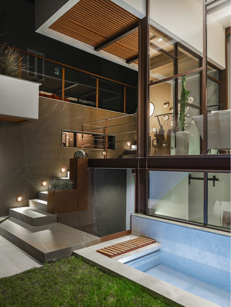 Вытянутый широкий фасад с окнами в рамах из стального профиля отражается в небольшом бассейне, где и днем, и ночью играют отблески света и бьют струйки воды, создавая совершенно волшебную атмосферу. Солнцезащитный козырек ограждает от ярких лучей и создает тень в течение всего дня, обеспечивая постоянный баланс между видимым и незримым.