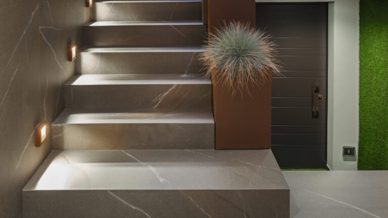 Оттенок Taupe с текстурой Fiammato, выбранный для отделки Sartoria degli Spazi, особенно гармонично встраивается в интерьер благодаря своему насыщенному подтону и способности оттенять детали. Впрочем, не стоит забывать и про технические достоинства поверхностей с этой текстурой: благодаря пространственной жесткости и устойчивости к коррозии, интенсивному воздействию, перепадам температур и изнашиваемости они будут идеальным решением для облицовки лестниц, коридоров и зон с повышенной влажностью, то есть пространств, где особенно важны безопасность и противоскользящие свойства.