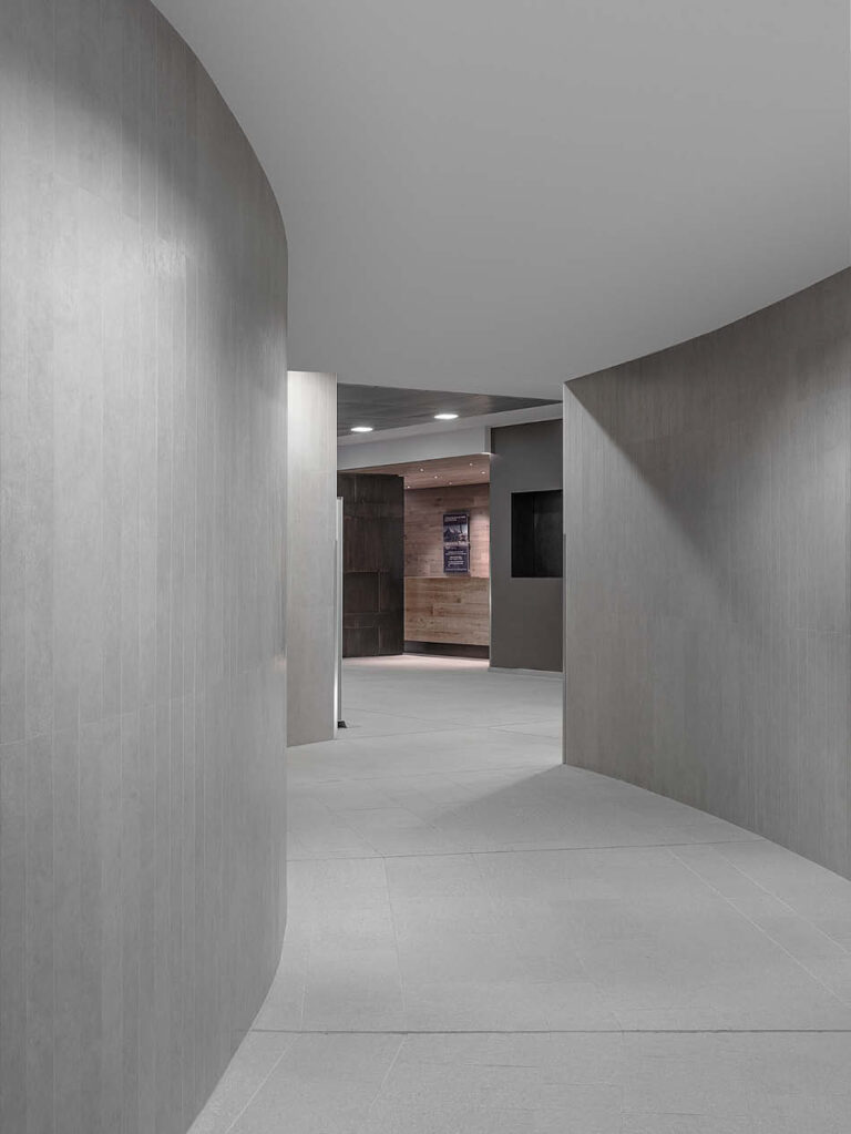 Для того чтобы встроить керамические поверхности Laminam в интерьер станций SkyWay Montebianco с их извилистыми и сложными стенами, они были нарезаны в виде специальных блоков.