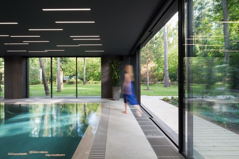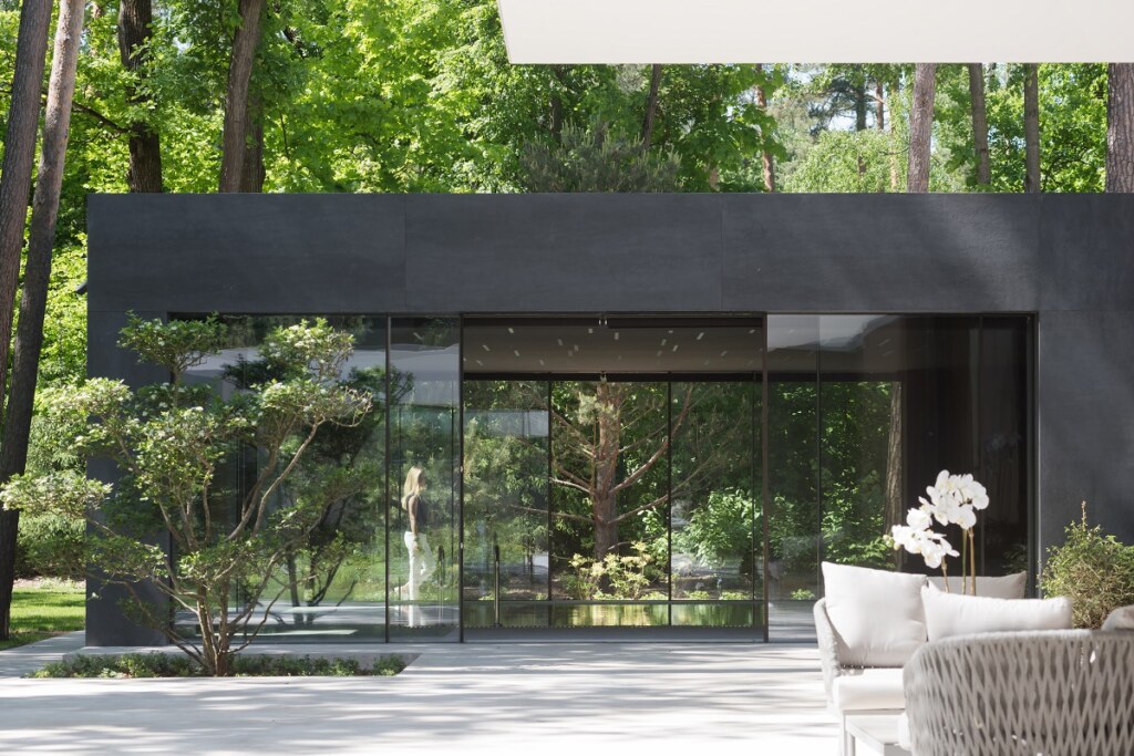 Вилла расположена в живописном месте среди высоких сосен в подмосковной деревне Жуковка. Пожеланием заказчиков был современный дом с определенным количеством помещений при этом гармонично интегрированный в природу. Важно было сохранить максимальное количество деревьев на участке. Поэтому строительство проходило с очень бережным отношением к густо расположенным деревьям.