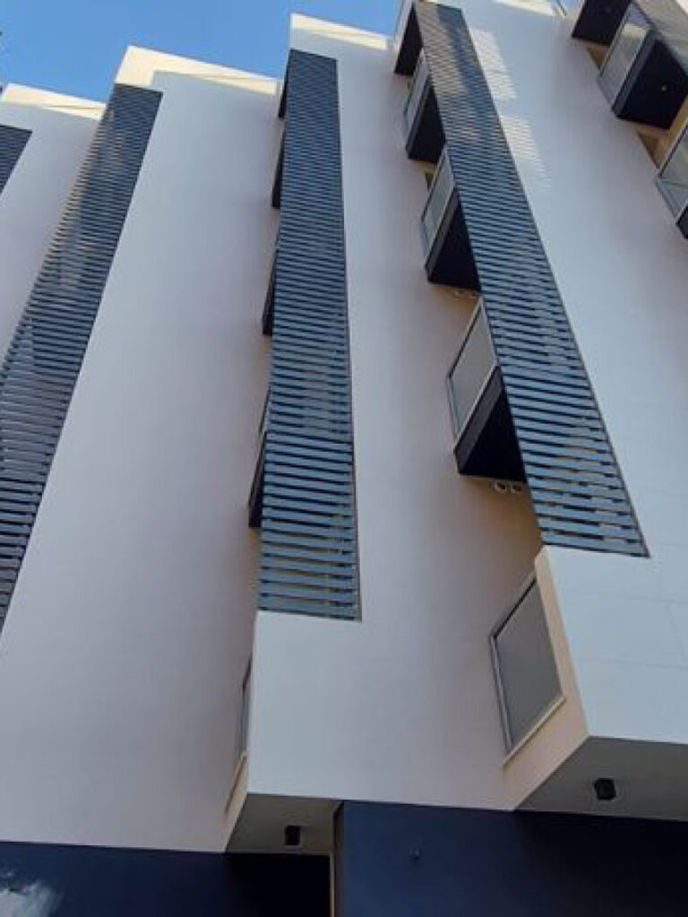 The strong and essential lines of Rossinicinque, given by the symbolic element that characterises the main façade, are the result of a proportion between the vertical thrusts created by the sunshade and the horizontal thrusts of the terraces, which through plays of perspective harmonise the perception and impressiveness of the building. Together with the glass windows and the large terraces, two architectural elements stand out in the design: the wall partitions form a geometric pattern that creates a play of light and shadow, and the grigio scuro sunshade, a suitable finish to protect the interior spaces from the strong summer sun, a trend of the entire complex. This ‘red thread’ wraps around all the terraces of the building, connecting the back with the front, thus giving a homogeneous interpretation to the entire building and creating a play of colour contrasts with the large Laminam surfaces applied as external cladding to the façade. Chosen in the Neve shade of the Collection series in Laminam 3+ thickness and 500×1500 mm size, the neutral shade with a hint of silver recalls a feeling of freshness, fills spaces and volumes, restoring style, elegance, but also softness.
