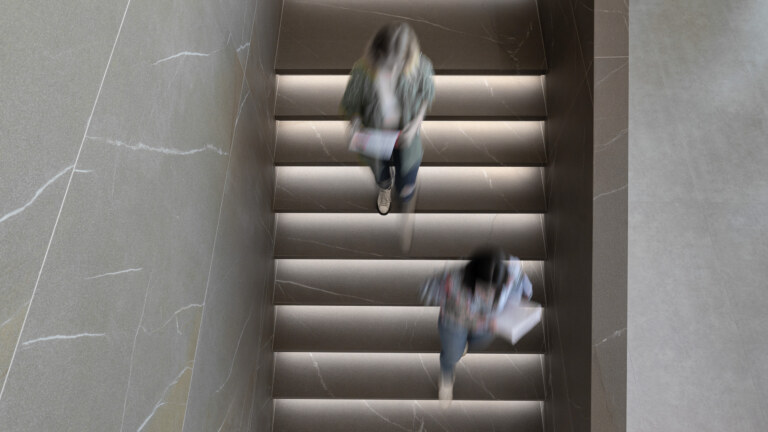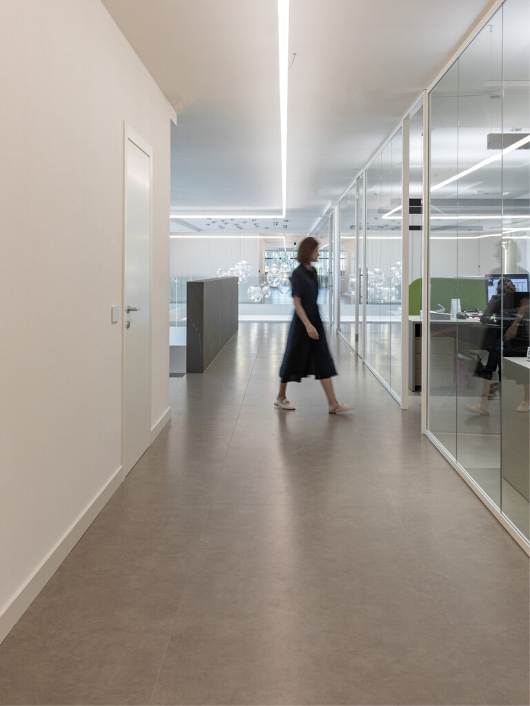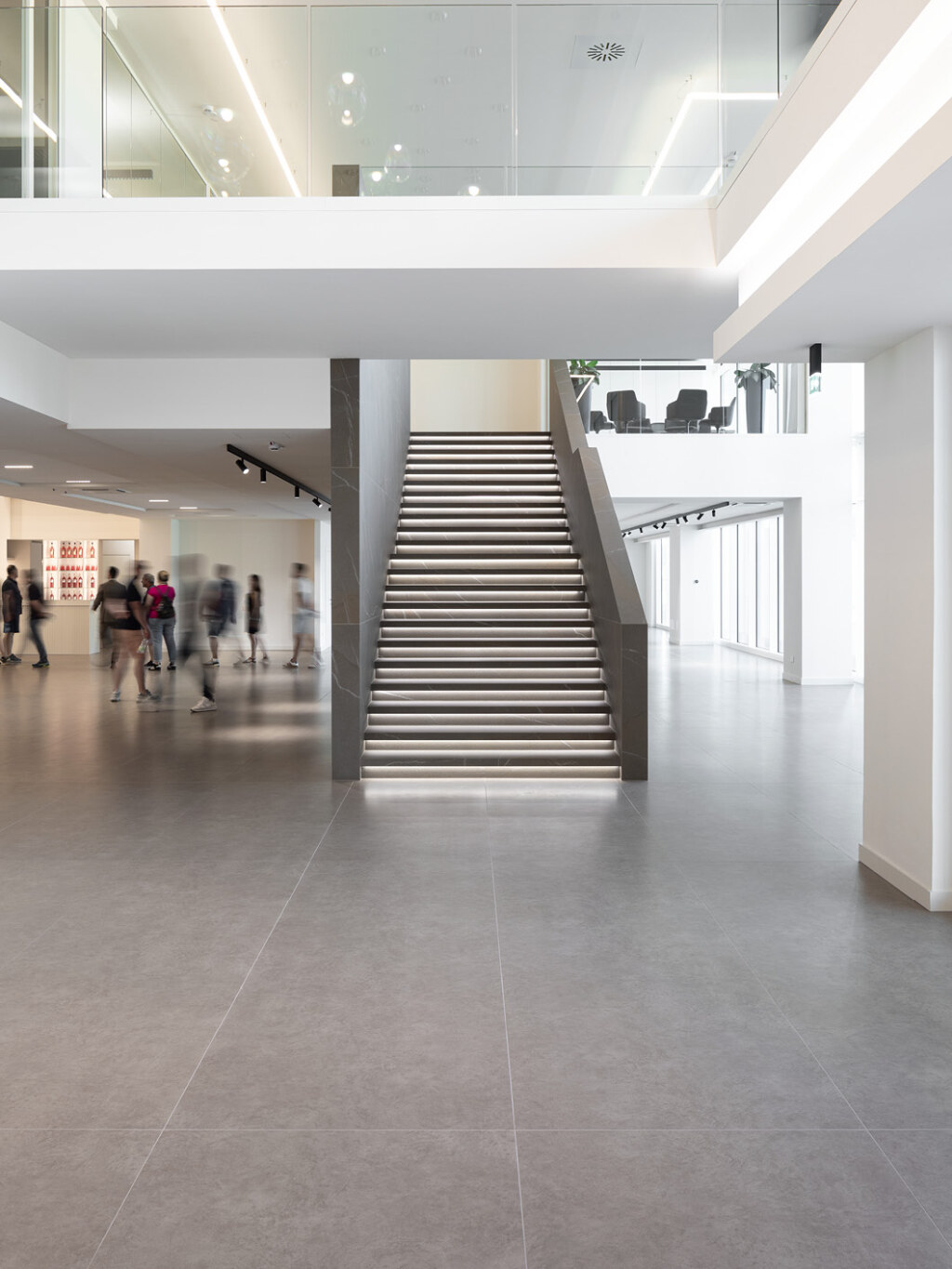 IN-SIDE también crea un vínculo entre el interior y el exterior: en efecto, la tonalidad Pietra Piasentina Grigio, además de la fuente sobre la que está apoyada la escultura, reviste la escalera monumental interior, con peldaños compensados y ledes incorporados en voladizo, que se yergue en la entrada de la sede. Se trata de una elección estratégica y estética, orientada a la ligereza y a resaltar el material, hilo conductor del diseño de los espacios interiores. La doble altura de las plantas, iluminadas por tubos de luz, se inspira en el minimal art estadounidense, entre juegos de luz, símbolos y transparencias que crean un ambiente de trabajo armonioso.